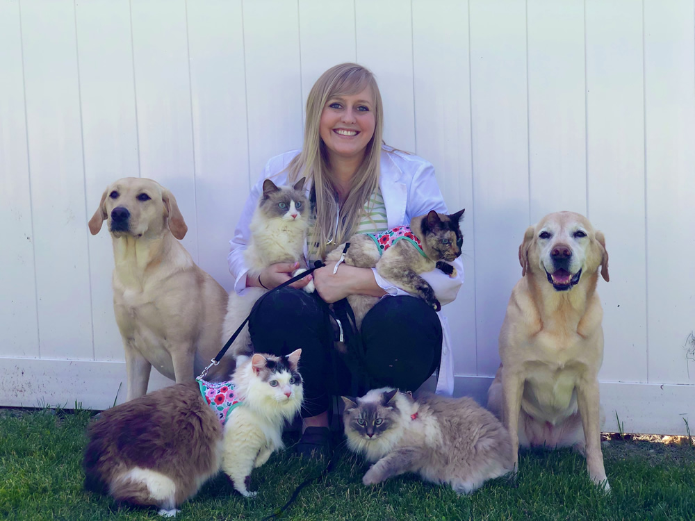 including 5 cats, "Olive", "Sushi", "Jellybean", "Fig" and "Strudel" and two beautiful yellow labs, "Lemon", and